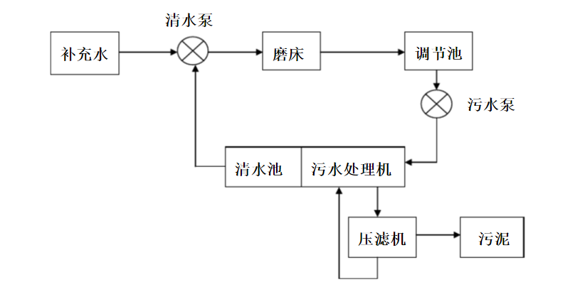 磨削工段的磨床在工作之時(shí)一般需要水作為冷卻劑,排出的冷卻水中含有磨料粉末及加工件的微小懸浮顆粒,冷卻水不經(jīng)處理直接排放的話會(huì)堵塞管道、污染環(huán)境。